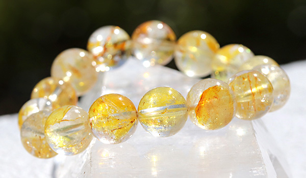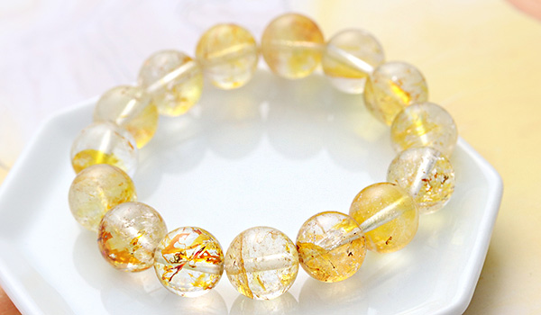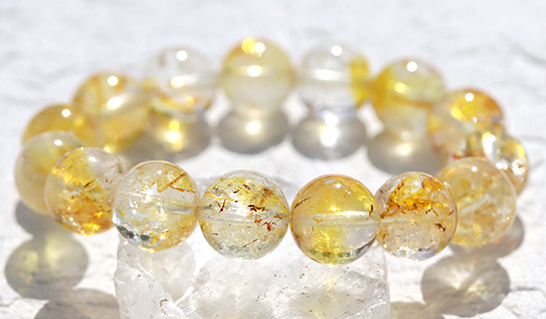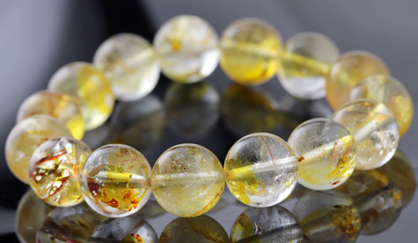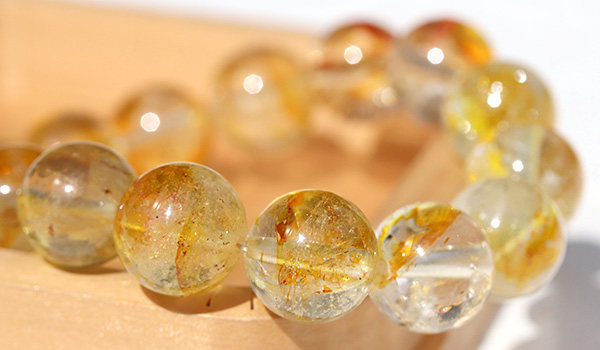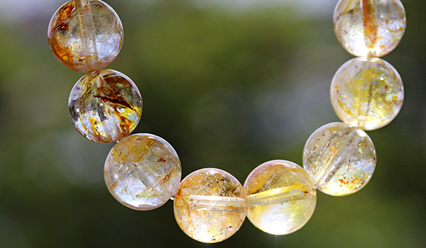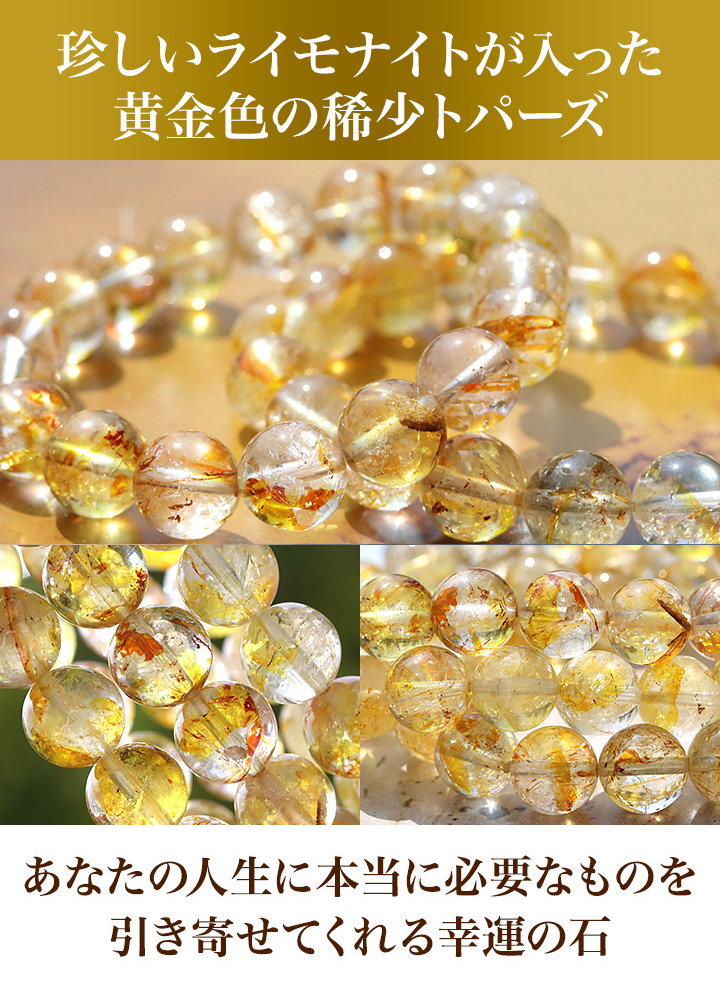 うっすらとゴールデンイエローに色づいたトパーズの中に、オレンジや黄色、朱色に輝くライモナイトが入り込んだ