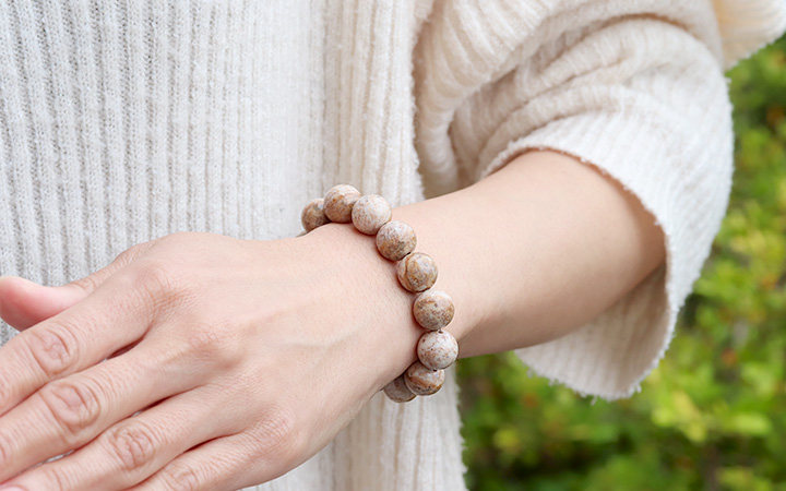 石の特性上、表面に傷や凹みが見られるビーズや、形が真円ではなくやや歪さを感じられるビーズも使用しております。あらかじめご了承の上お買い求めくださいませ。
