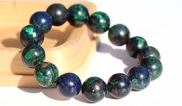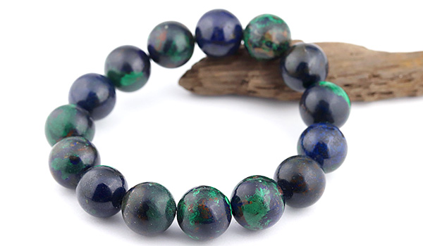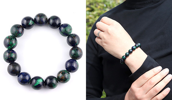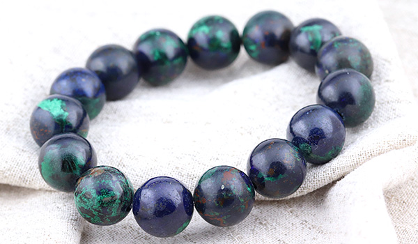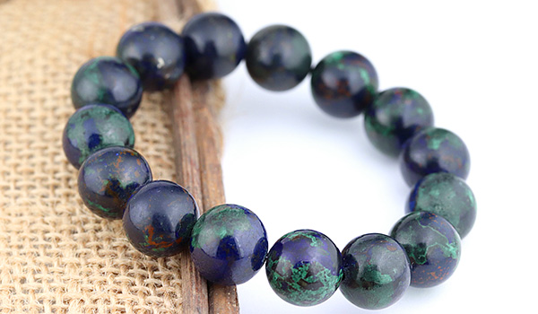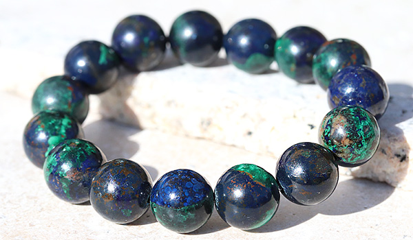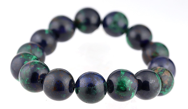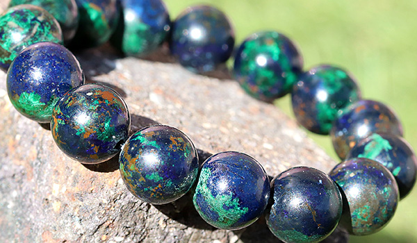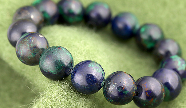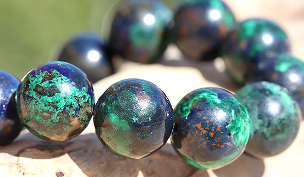 ベースとなるアジュライト部分の深く濃い藍色に、マラカイトの緑が鮮明に映え、しかもビーズによってはマラカイトに