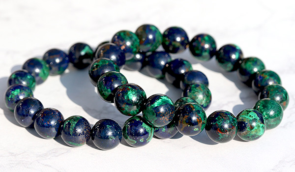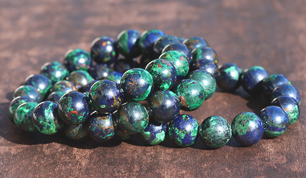 今回入荷しているアズロマラカイトは、ビーズごとにアジュライトとマラカイトの比率が異なるものの、