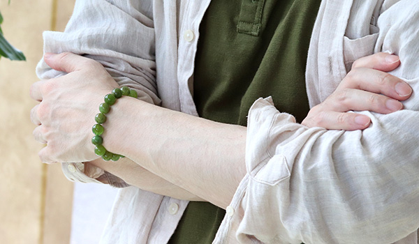 しかしよく見ると一珠ごとに少しずつ、鮮やかなグリーンや深いグリーンが入っていて、見る角度によって雰囲気が異なって見えます。