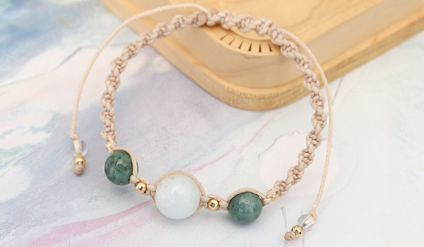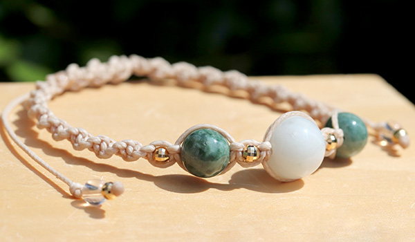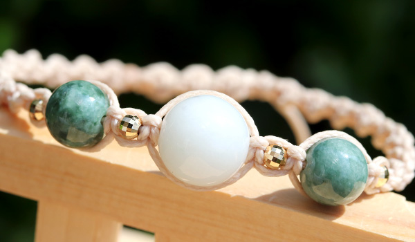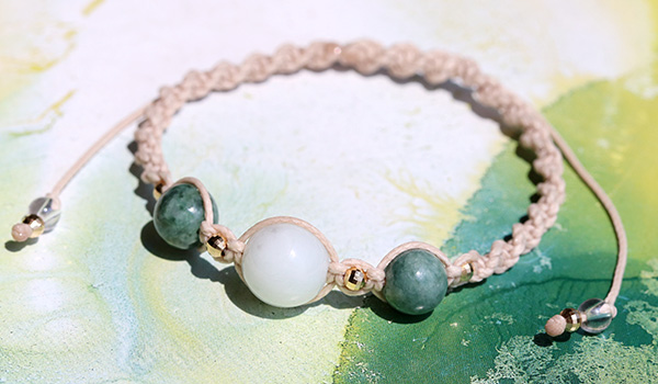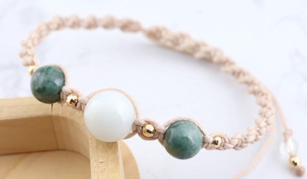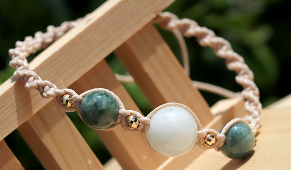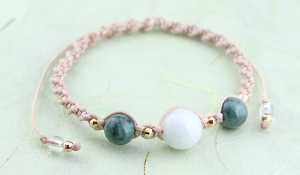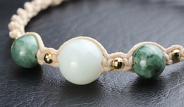 こちらのブレスレットには、中央に淡く優しいミルキーな発色が美しい10〜10.5mmの糸魚川白翡翠を、その両サイドには柔らかい緑色と濃い緑色とが斑になっている8〜8.5mmの糸魚川翡翠のビーズを組み合わせました。