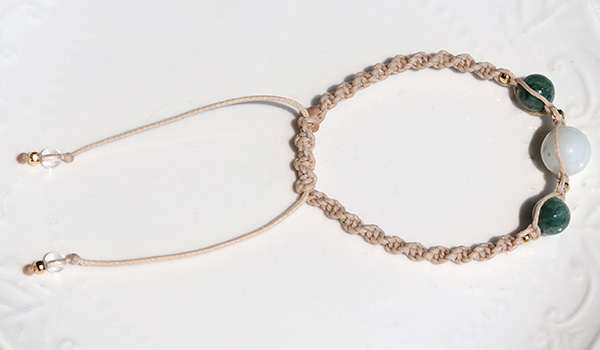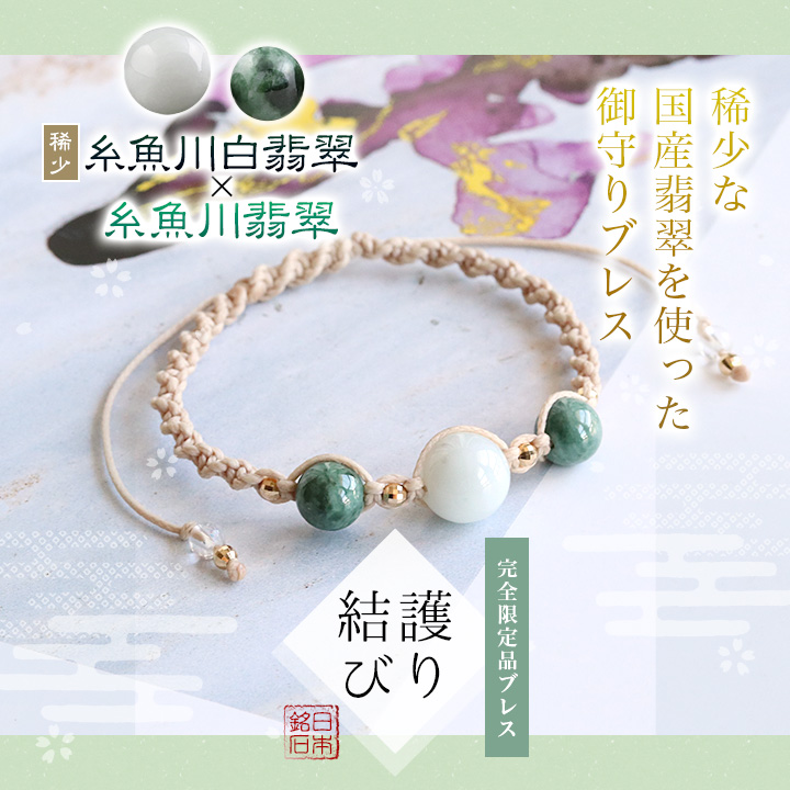完全限定品ブレス【護り結びVer.2】は、日本が誇る美しき国産ストーンである糸魚川翡翠をナチュラルなベージュのカラーコードで編み込んだ、デザイン性の高い守護ブレスです。