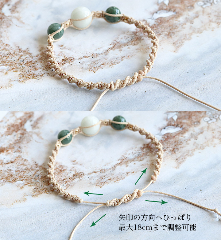 こちらのブレスレットは、自分で自由にサイズ調整ができる作りとなっており、手首サイズ14cm〜18cmまでの調節が可能です。