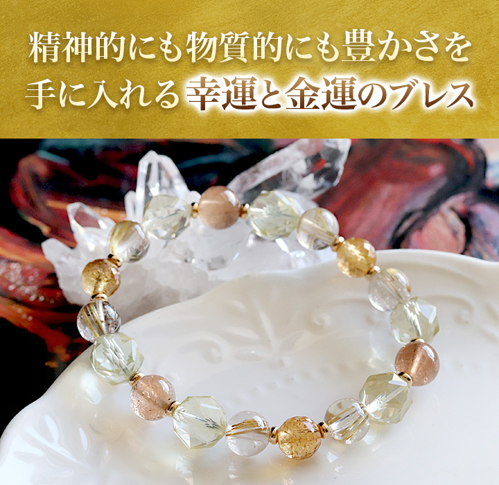 豊かさ・豊潤・裕福という単語の意味そのままを形にしたような、石たちのきらびやかな輝きに目を奪われるブレスレットです。