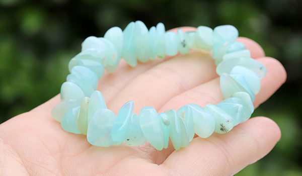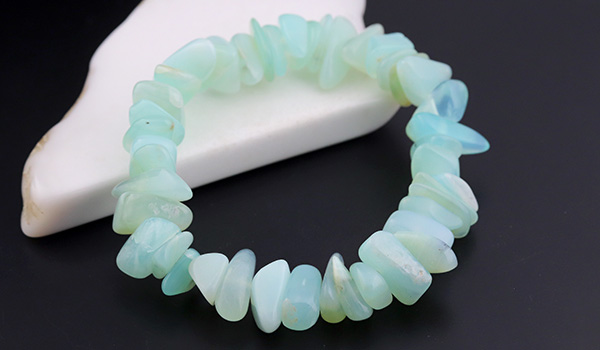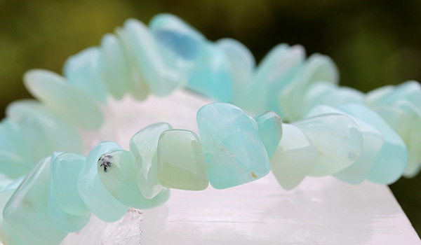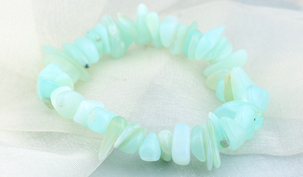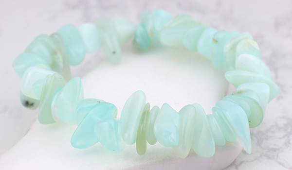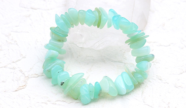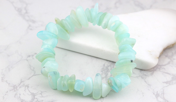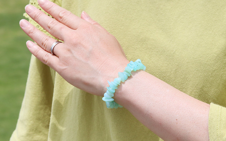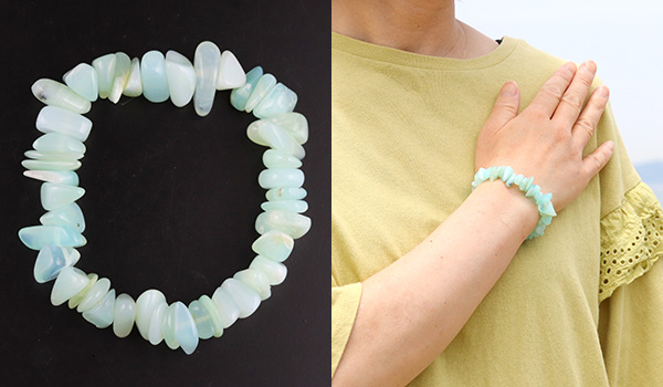 瑞々しく清涼感に満ちたミントグリーンの色合いが美しい、ブルーオパールのさざれパーツを素通しにしたブレスレットが、数量限定で登場しました!