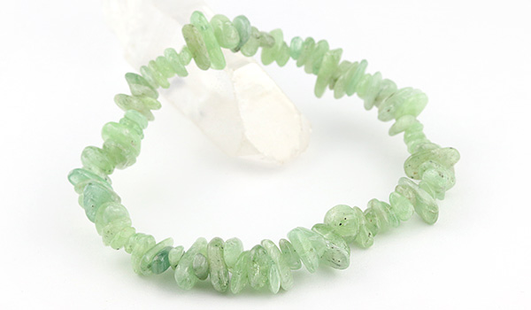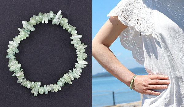 ミルキーなミントグリーン色が可愛らしいグリーンカイヤナイトのさざれパーツを素通しにしたブレスレットです。