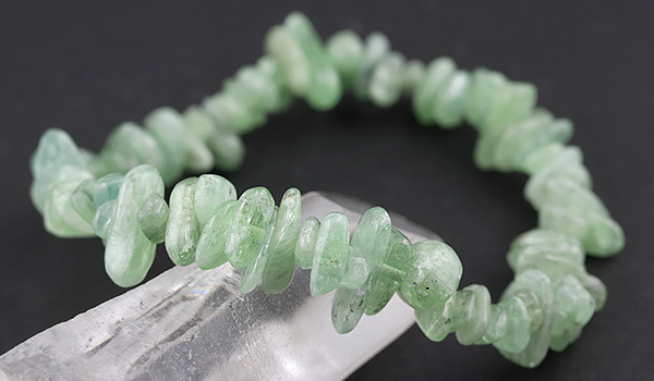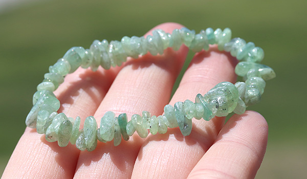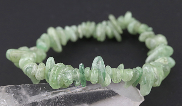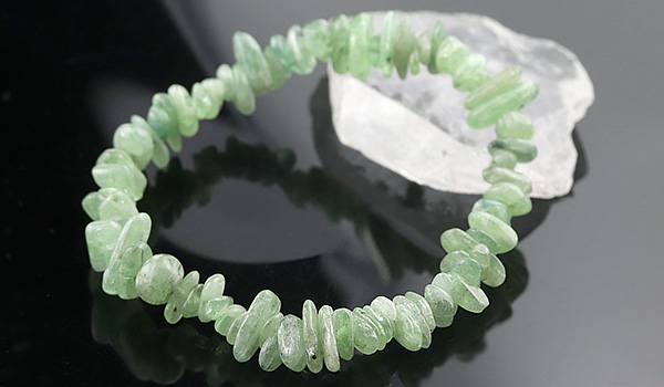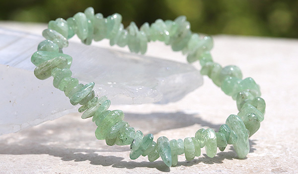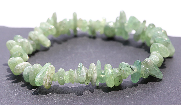 ●スタンダードなブルーのものとは全く異なる色合いが目を引く、グリーンカイヤナイトのさざれを使用したブレスレット