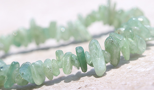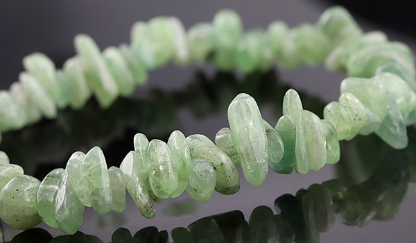 今回使用していますグリーンカイヤナイトのさざれは、角には丸みをもたせていますが、原石をそのまま砕いたような