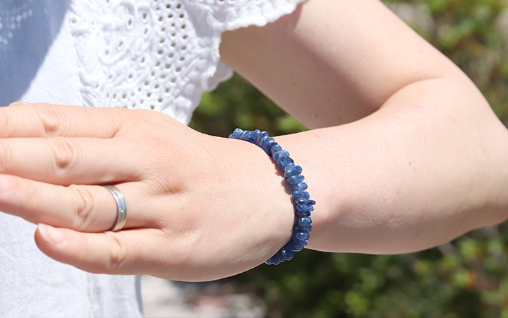 爽やかな雰囲気になるカイヤナイトのさざれパーツを素通しにしたブレスレットです。