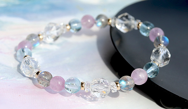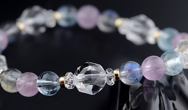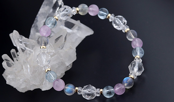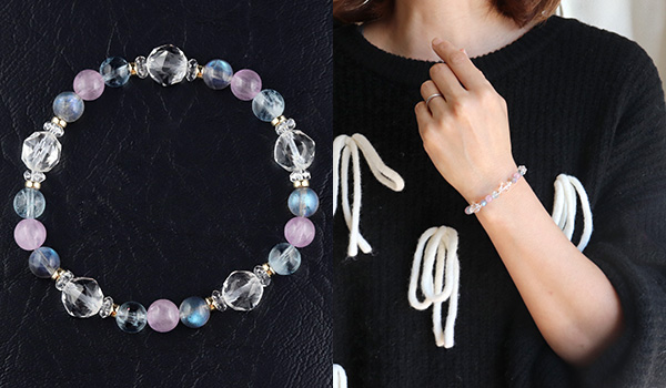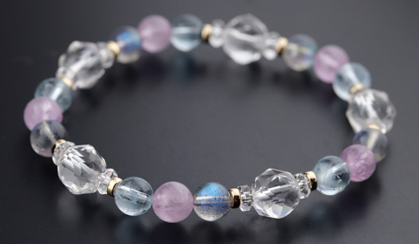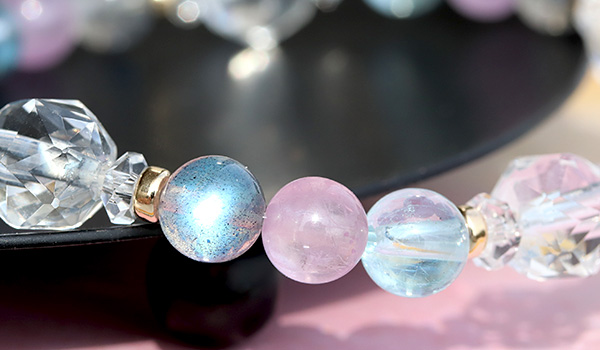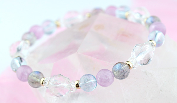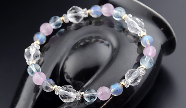 という三種類のパワーストーンビーズを組み合わせることで、美しい透明感と繊細な発色、光によって生み出される美しい輝きが魅力的なブレスレットに仕上がりました。