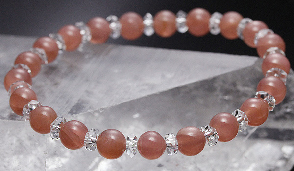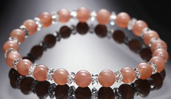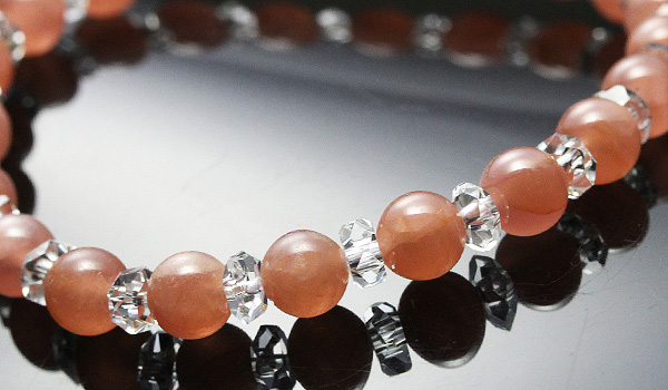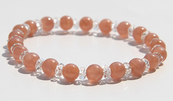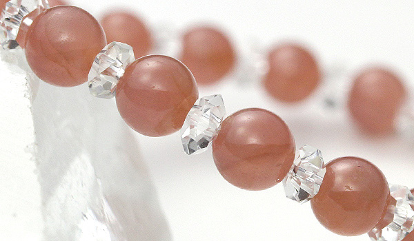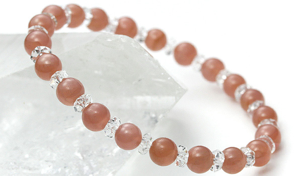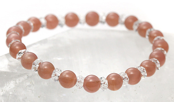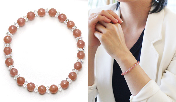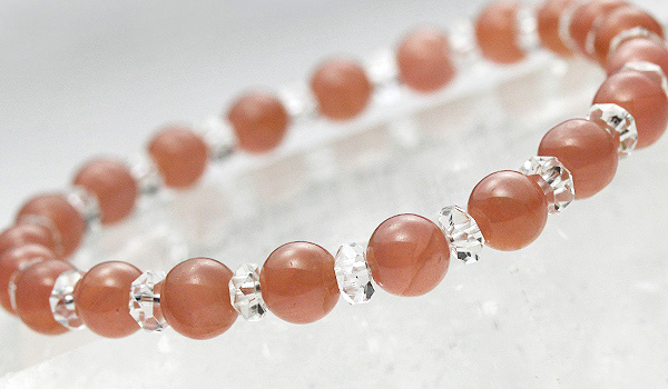落ち着いた朱赤色のインカローズに、水晶平カットを挟み込んだハーモニーブレスをご紹介します。