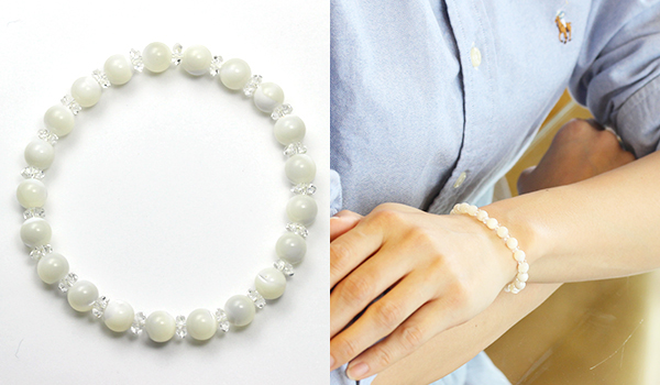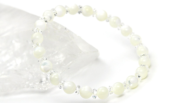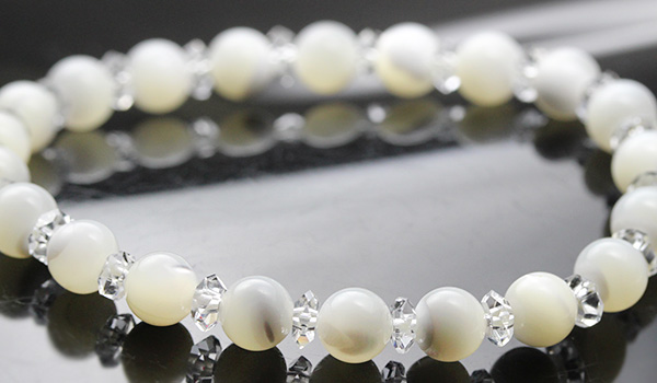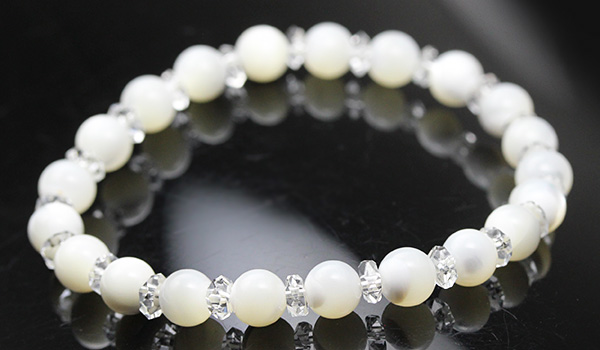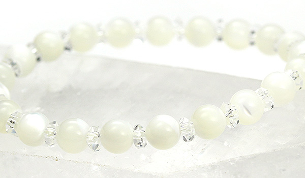 ほのかに透明感が感じられるホワイトカラーに、くっきりしたミルク色とが溶け合うマザーオブパールと、水晶の平カットとを交互に紡いだ、シンプルデザインのブレスレットです。