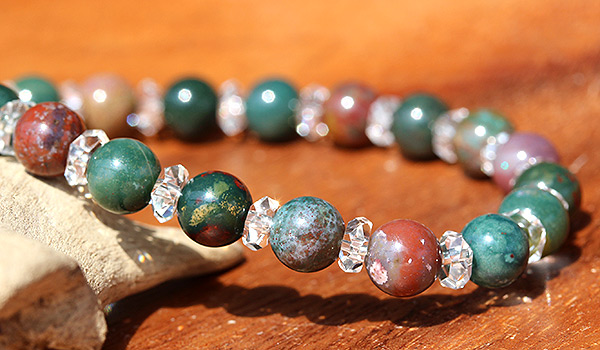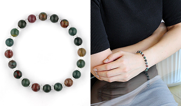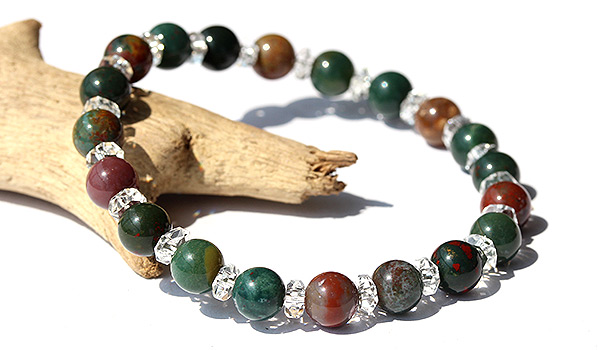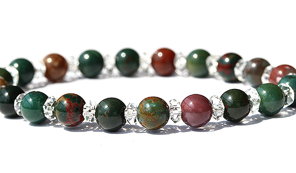 深い緑の発色に、細かな赤色がアクセントに入り込んでいるブラッドストーンと水晶の平カットとを交互に紡いだ、シンプルデザインのブレスレットです。
