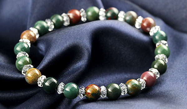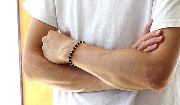 こちらのブレスレットには、深緑色がベースカラーとなっているビーズをメインに、削り出した部分によって赤色の部分がメインに来ているものをアクセントに挟み込んでおり、複数の石を使用したブレスレットのようにも見えます。