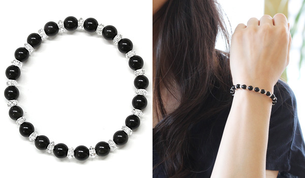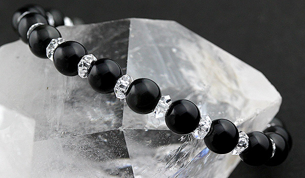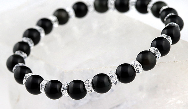 ただの真っ黒い石にしか見えないのに、光を当てる角度によってうっすらと別の色が浮かぶという、不思議な美しさを持つレインボーオブシディアンを使用したブレスレットをご紹介します。