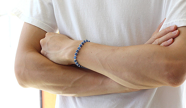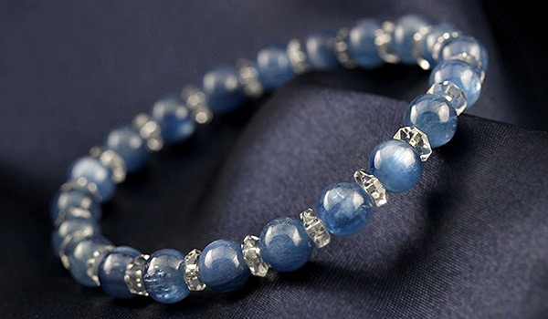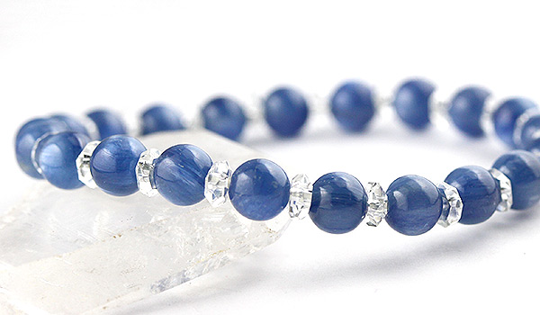 ほのかに銀色がかった輝きを見せる深い青の発色が美しいカイヤナイトと、水晶の平カットとを交互に紡いだ、シンプルデザインのブレスレットです。