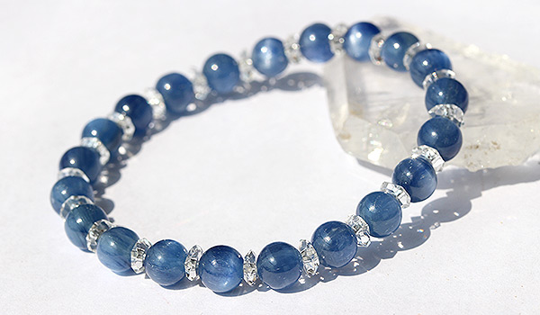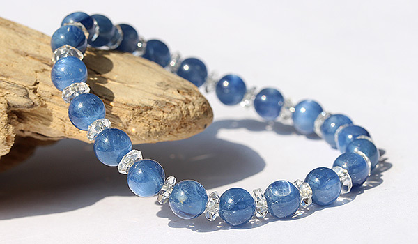 この美しく魅力的な青を呈するカイヤナイトに、水晶の小さなカットビーズがキラキラと光を反射して、輝きを添えます。