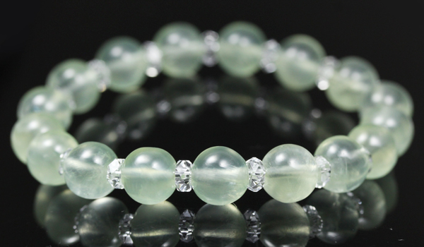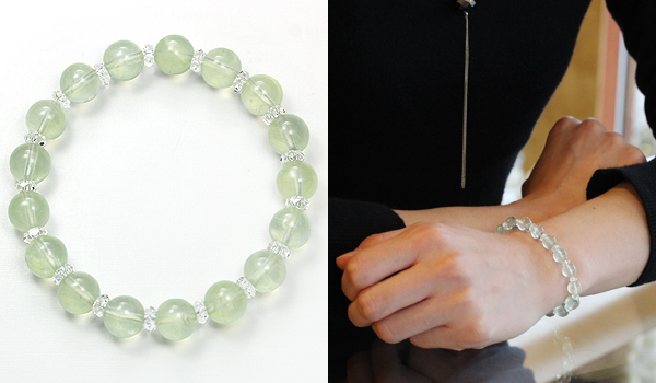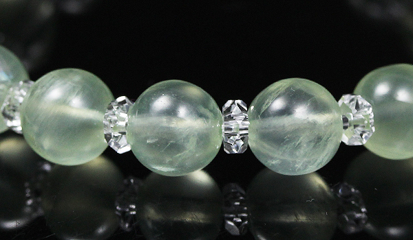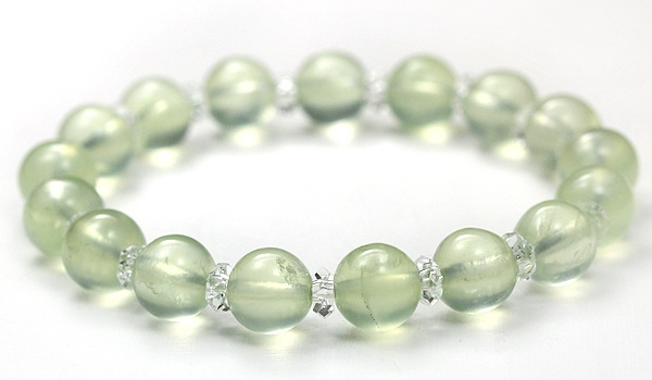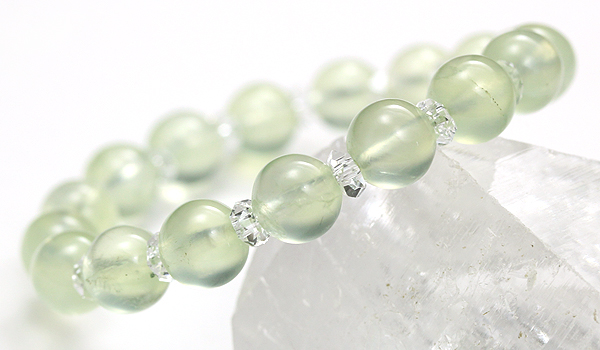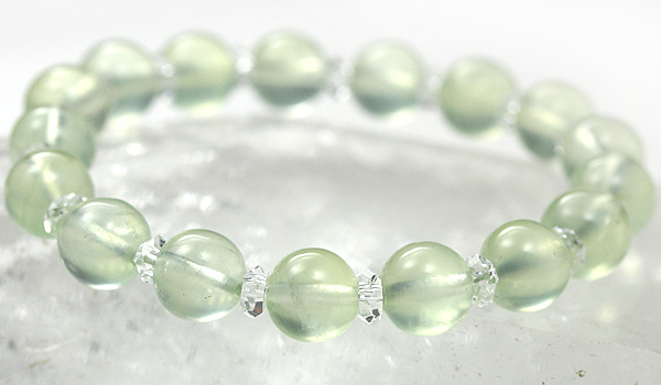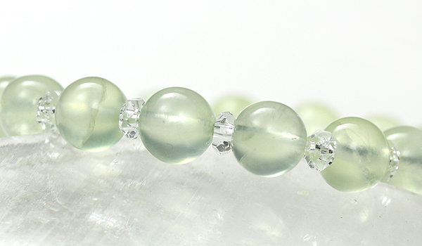 淡いマスカットグリーンの色合いと潤んだような質感が魅力的なプレナイトと、水晶の平カットとを交互に紡いだ、シンプルデザインのブレスレットです。