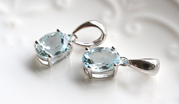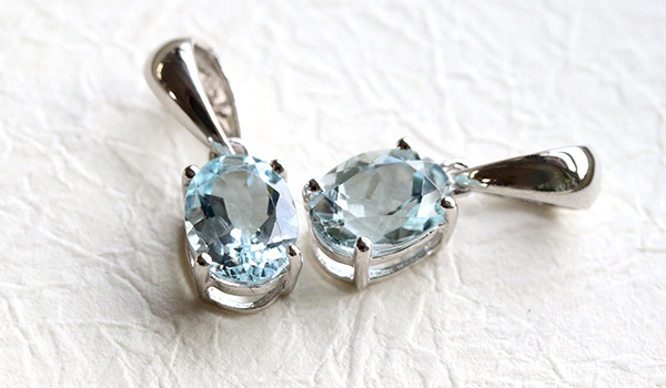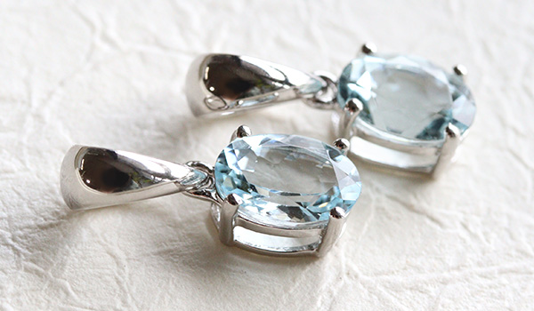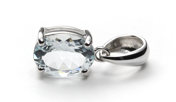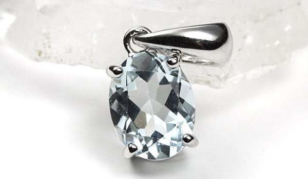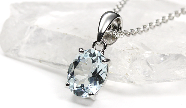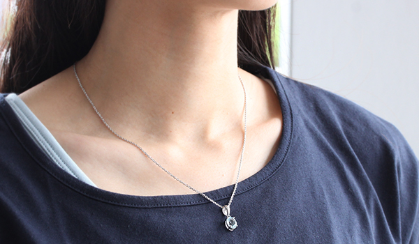 水晶を思わせる抜群の透明度と、淡い水色の発色が綺麗なアクアマリンを使用した一粒ペンダントをご紹介します。