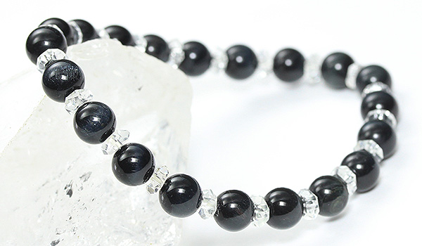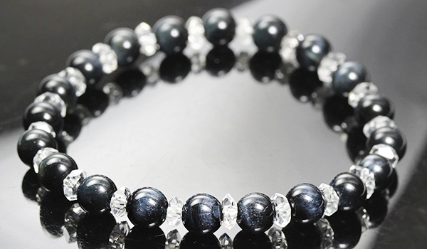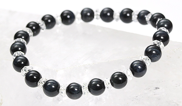ダークネイビーの地色にキラリと青色の光を輝かせるブルータイガーアイと、水晶の平カットとを交互に紡いだ、シンプルデザインのブレスレットです。