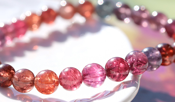 オレンジに近い赤と華やかなホットピンク、落ち着いたオレンジに紫、うっすら黒みがかった青色など、強さを感じられる鮮やかな発色のスピネルをバランスを見ながら繋いだ、
