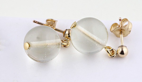 透明感のある淡いシャンパンゴールド色が美しいリビアングラスの9.5mm珠に、K14ゴールドフィルドのピアスパーツを組み合わせたピアスが、