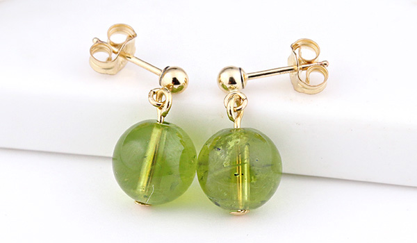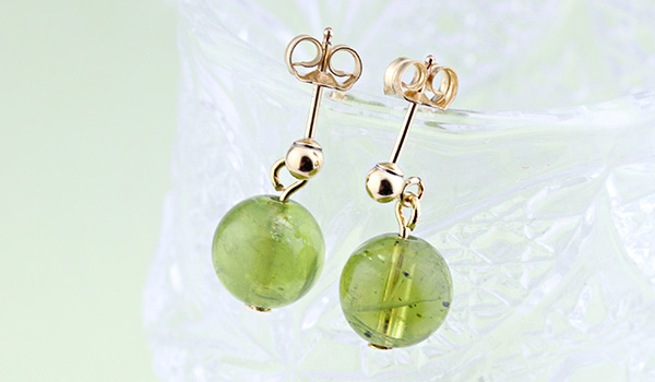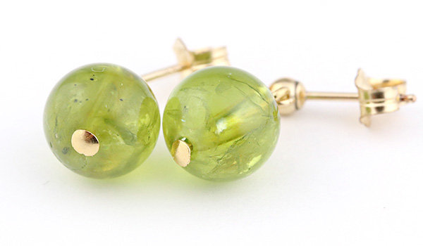 オリーブグリーンの発色が美しく、オイルを塗り込んだような光沢感のあるペリドットの8.5mm珠に、K14ゴールドフィルドのピアスパーツを組み合わせたピアスが、