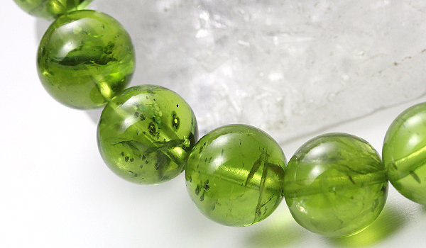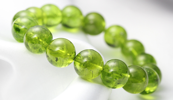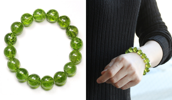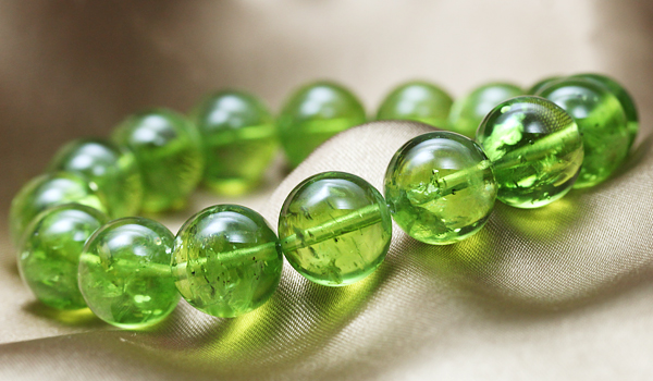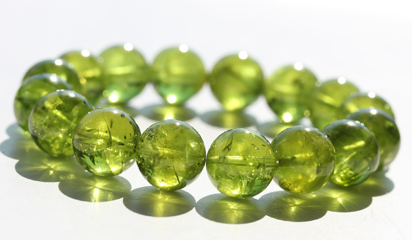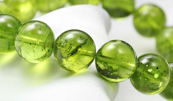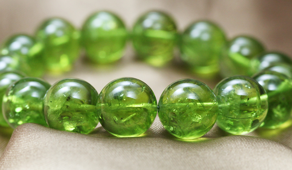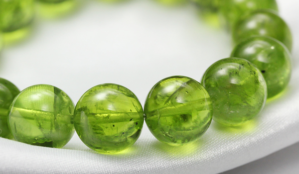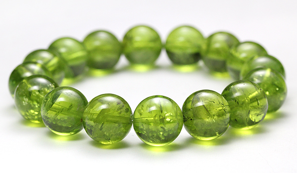 金色の光を内に閉じ込めたような美しい色合いに、まばゆく照り輝く光沢感、そして透明度も申し分なしという、まさに三拍子そろった大粒のペリドットを、素通しのブレスレットにしてご紹介します。