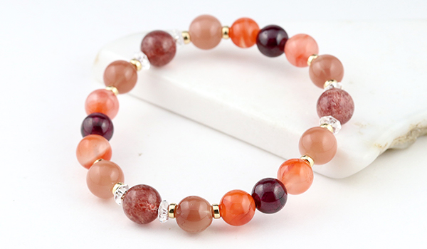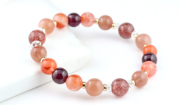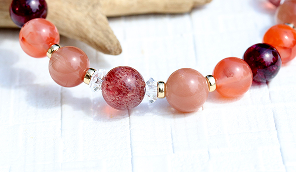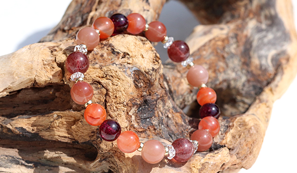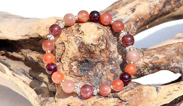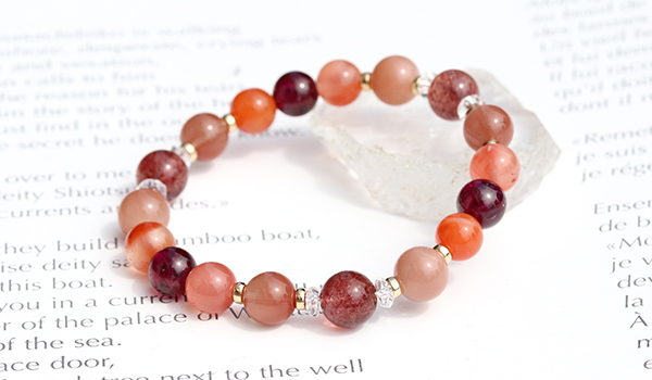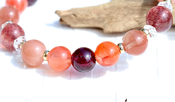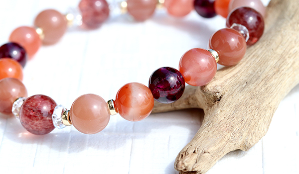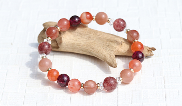南紅瑪瑙が生命力と情熱を高め、ロードライトガーネットが物事を好転させていくエネルギー、アンデシンが変容と変革の力を養い、オレンジムーンストーンが温かな共感性と直感力で道を照らし、アフリカンストロベリークォーツが自信と積極性、そして物事を生み出すクリエイティブな感性を高めてくれる。それぞれが見事に補い合い、「私はできる」という確信を魂の深いところから引き出してくれるブレスレットに仕上がっています。