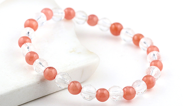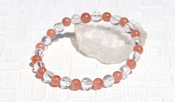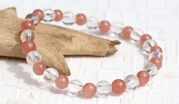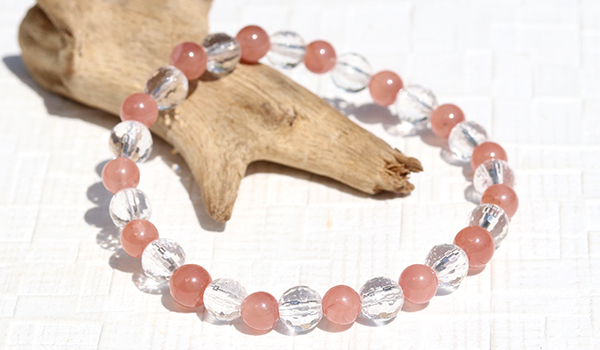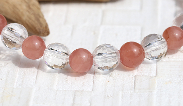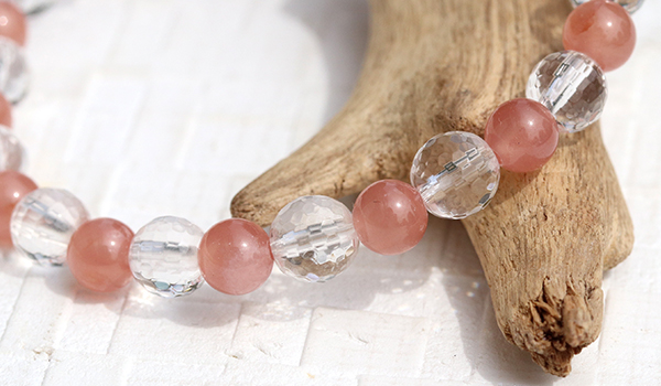 太陽の光を受けた時、128面カットの水晶が無数の光の粒を飛ばしながら輝く様子は、まるで光の粒がブレスレットの上で踊っているかのようです。その透明な輝きがインカローズのやわらかなピンクをより一層引き立て、清潔感と品格を同時に演出しています。