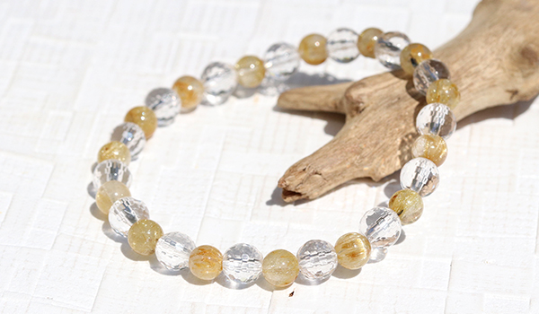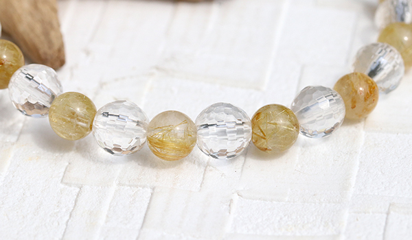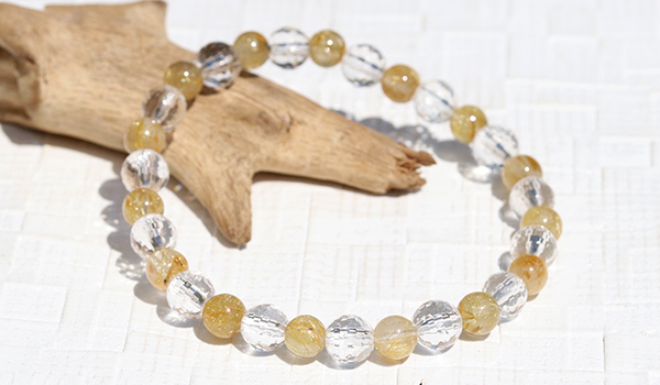 金線が舞い散るルチルクォーツと、鏡のように光を弾く128面カット水晶が、規則正しいリズムで交互に並ぶこのブレスレットは、細身でありながら驚くほど存在感があります
