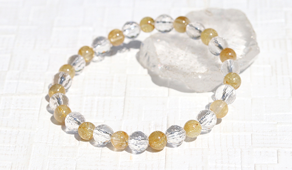水晶の透明度も高い中に金針がしっかりと含まれており、とってもエネルギッシュです。太陽光に当てるとキラキラと輝き、手首に光の輪を身に着けたようです。