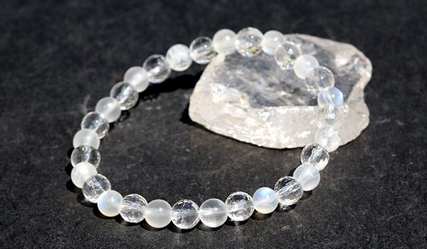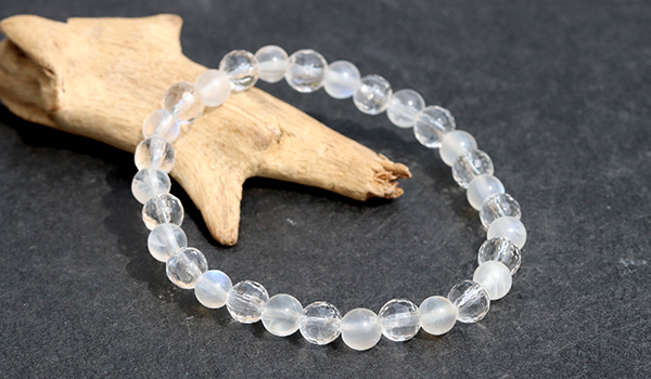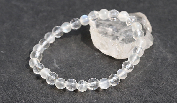 優しい神秘的な美しさのブルームーンストーンと、鏡のように光を弾く128面カット水晶が、規則正しいリズムで交互に並ぶこのブレスレットは、細身でありながら驚くほど存在感があります。
