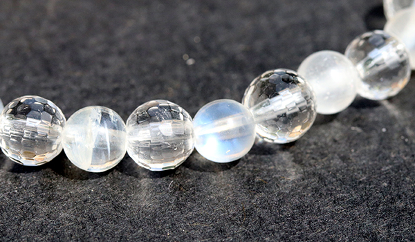 ブルームーンストーンは柔らかい乳白に青い光が宿る優しい美しさを持つタイプで水晶の透明度とのコラボレーションが本当に素敵です。色がついているわけではないので、一瞬見ると水晶岳のブレスレットに見えてしまうかも知れません。しかし、