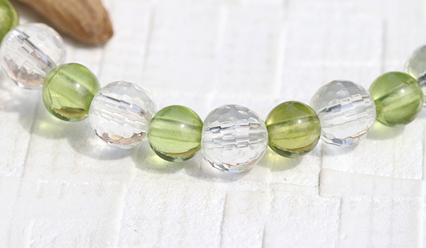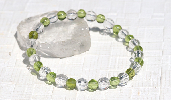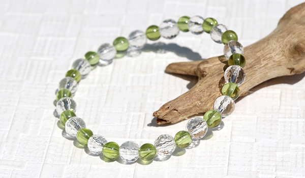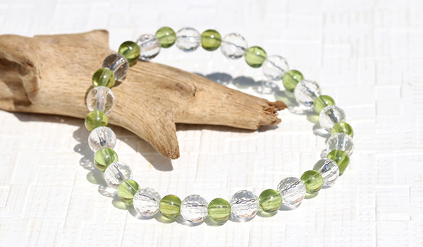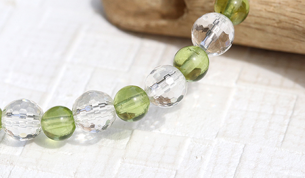 太陽の光を受けた時、128面カットの水晶が無数の光の粒を飛ばしながら輝く様子は、まるで光の粒がブレスレットの上で踊っているかのようです。その透明な輝きがペリドットの鮮やかなグリーンをより一層引き立て、清潔感と品格を同時に演出しています。