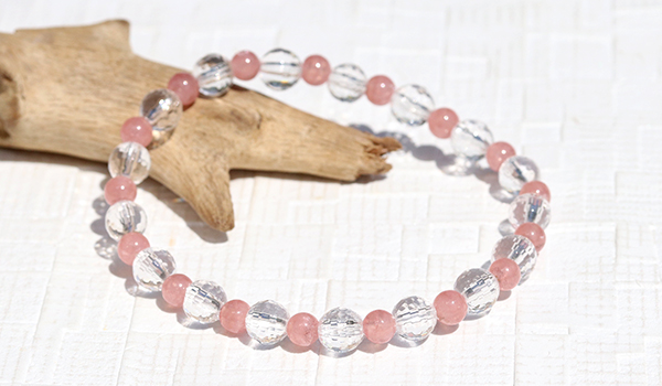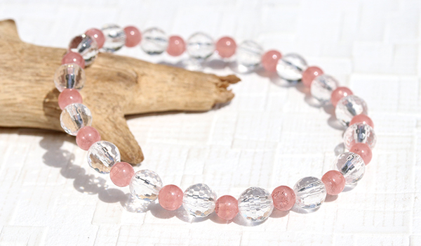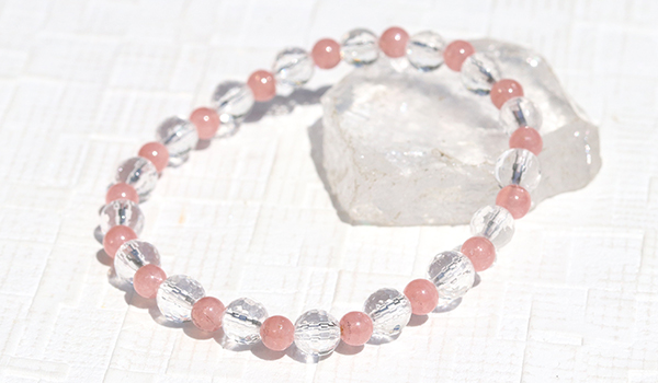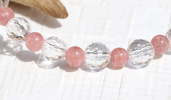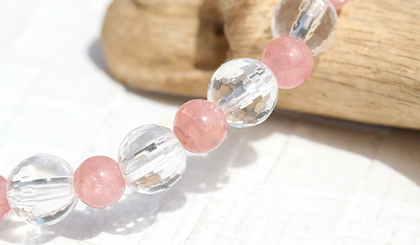 太陽の光を受けた時、128面カットの水晶が無数の光の粒を飛ばしながら輝く様子は、まるで光の粒がブレスレットの上で踊っているかのようです。その透明な輝きがインカローズのやわらかなピンクをより一層引き立て、清潔感と品格を同時に演出しています。