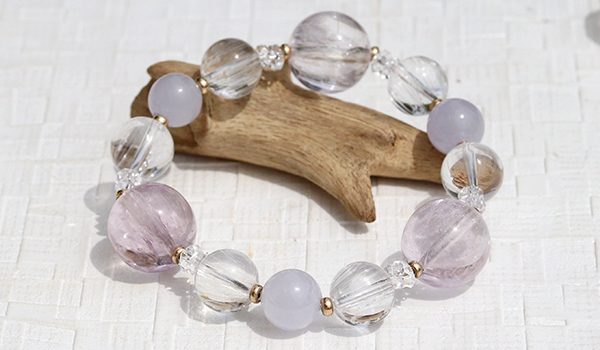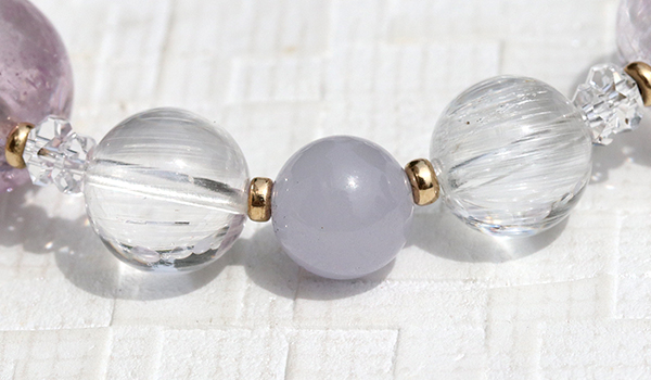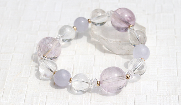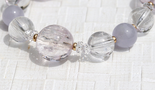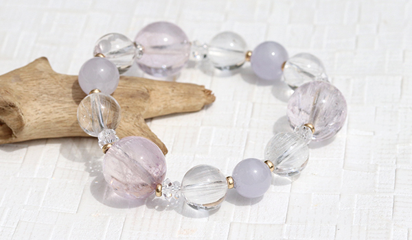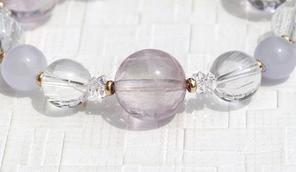 クンツァイト15mm、マダガスカル産カラーレスキャッツアイトパーズ11mm、ラベンダー翡翠10mm
